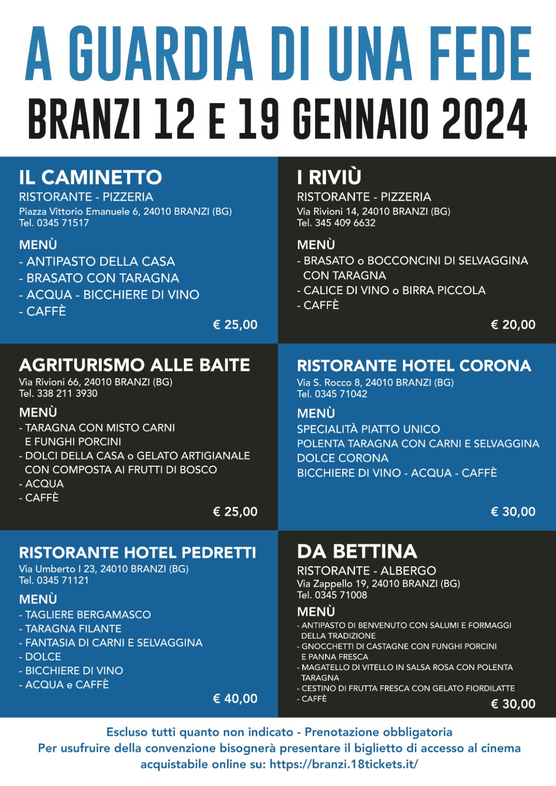 Nell'ambito dell'attività della Sala Parrocchiale del Cineteatro di Branzi abbiamo deciso di inserire nella programmazione due serate "Special Event" per i prossimi venerdi 12 e 19 gennaio dedicate al recentissimo "A GUARDIA DI UNA FEDE" di cui avete gia dato conto e risalto in occasione dell'uscita a Bergamo.