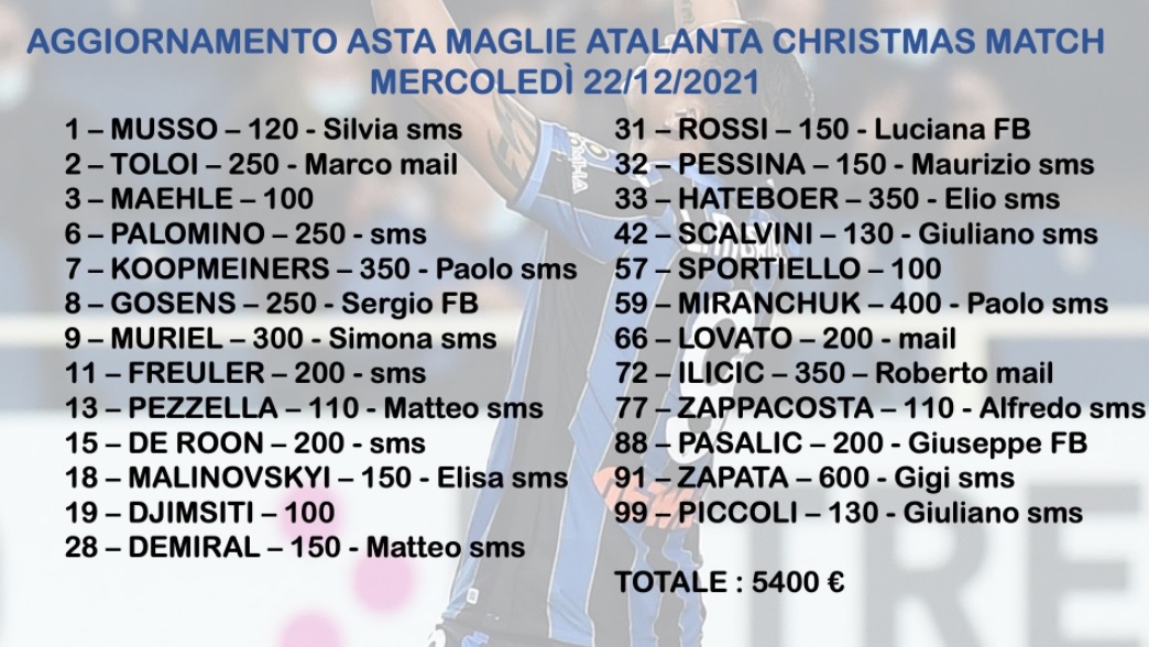 Le offerte possono essere effettuate in qualsiasi momento scrivendo un sms al 335 6969423 oppure un’email scrivendo ad [email protected] oltre che sulla pagina facebook di TuttoAtalanta: sotto la tabella con le offerte aggiornate alle 18 di oggi (22.12).