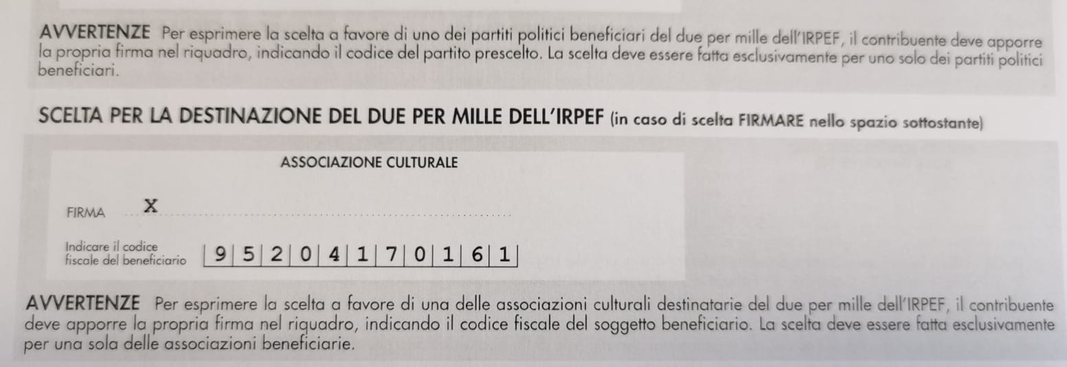 Da quest'anno, e grazie ad una nuova normativa introdotta pochi mesi fa, anche noi, come associazione culturale regolarmente costituita, abbiamo accesso al contributo del 2 x 1000 in sede di dichiarazione dei redditi.