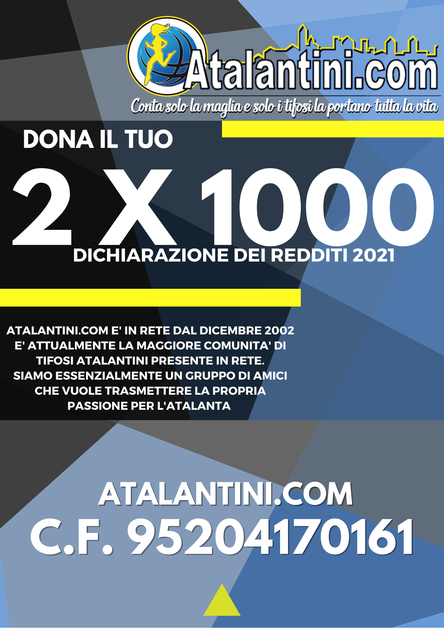 Grazie al 2 x 1000 se vorrete potrete destinare qualcosa al nostro sito, per le spese di cui sopra e magari anche per altre migliorie. Ricordiamo per chi non fosse pratico che il 2x1000 ( così come l'8 e il 5) non sono somme che cedete in più rispetto alle vostre tasse, ma una quota del vostro Irpef già calcolato che scegliete di destinare a noi. Un gesto che a voi non costa nulla ma che per noi può essere importante. Nei banner sul sito e qua in calce trovate i riferimenti da comunicare per la corretta indicazione.