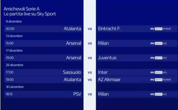 Su DAZN verrà trasmessa anche l'amichevole dell'Atalanta di Gian Piero Gasperini: i nerazzurri gocheranno poco prima di Natale, il 23 dicembre, contro il Betis Siviglia, in Spagna.