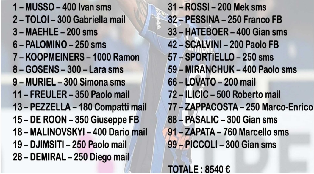Alla vigilia di Natale il valore complessivo dell'asta delle maglie a beneficio degli amici della pediatria ha raggiunto 8450€, Sul podio Koopmeiners con una offerta da 1000€, Zapata con 760€ ed Ilicic con 500€