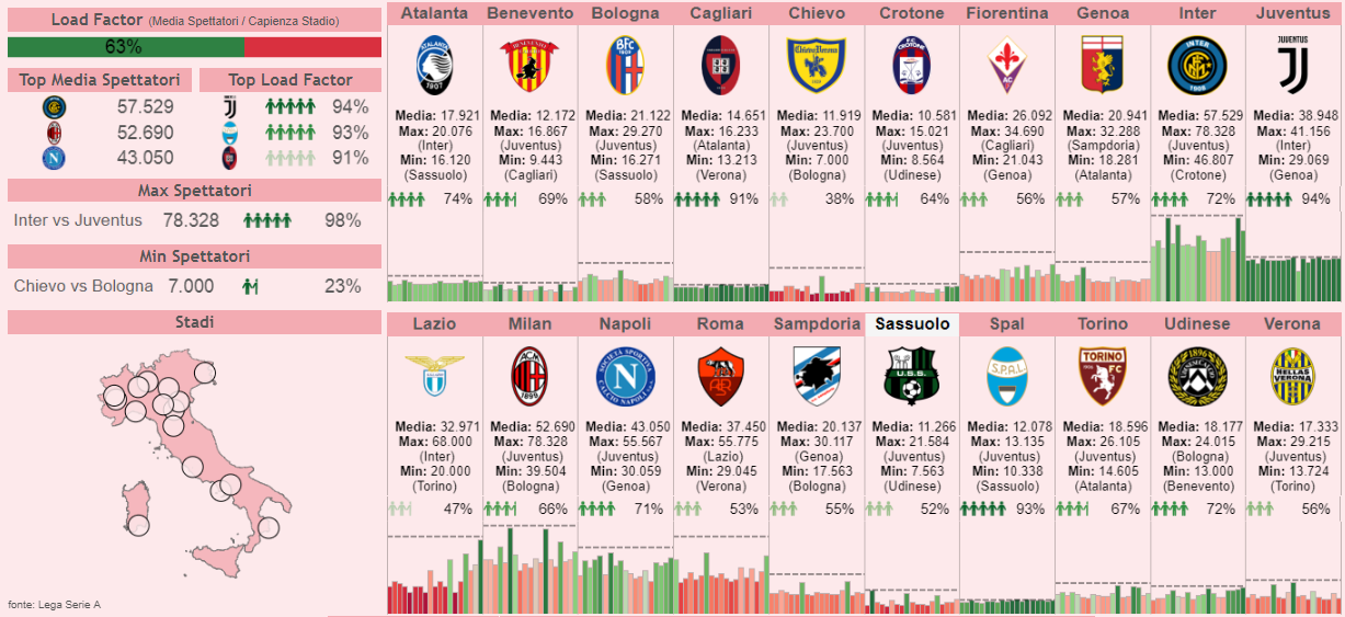 - Il nostro massimo lo abbiamo raggiunto con l'inter (20.076 presenze) ed il minimo col Sassuolo (16.120 presenze) insomma fra minimo e massimo la differenza è stata di poco superiore al 20%