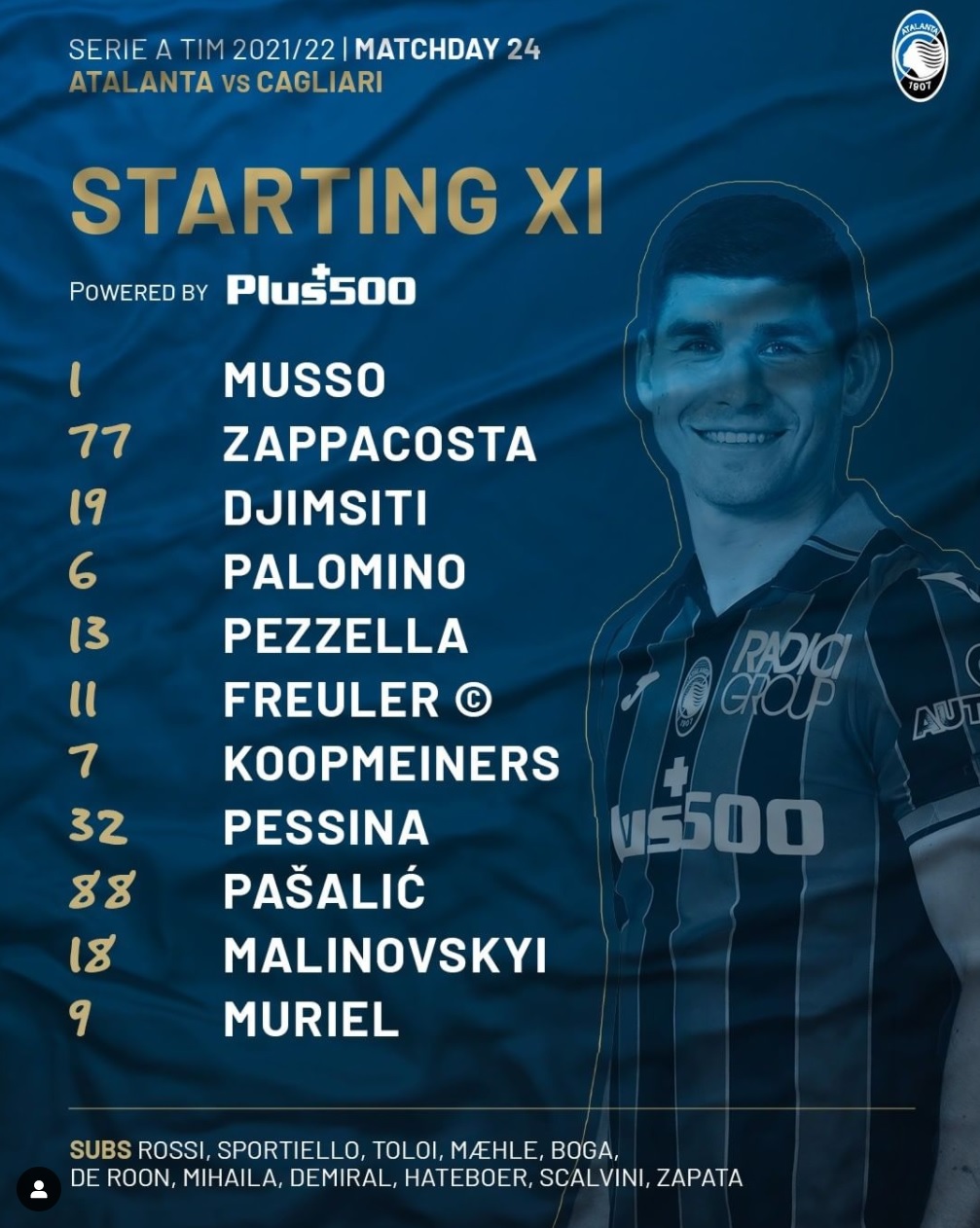 ATALANTA (4-2-3-1): Musso; Zappacosta, Djimsiti, Palomino, Pezzella; Freuler, Koopmeiners; Malinovskyi, Pessina, Pasalic; Muriel. All. Gasperini