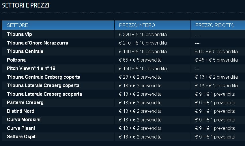 - online, con la possibilità della "scelta in pianta" del posto. Per tutte le info riguardo l'acqusito in modalità online consulta l'area dedicata qui sul sito: STADIO/BIGLIETTERIA/ACQUISTA ONLINE; per accedere direttamente clicca acquista online;