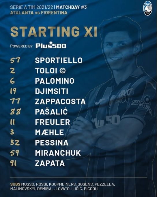 Pessina; Miranchuk, Zapata. A disposizione: Musso, Rossi, Koopmeiners, Gosens, Pezzella, Malinovskyi, Demiral, Lovato, Ilicic, Piccolo. All.: Gasperini