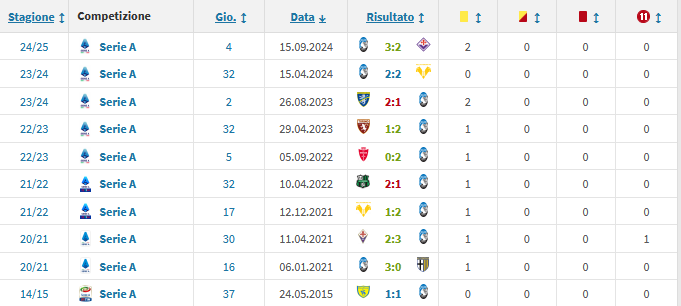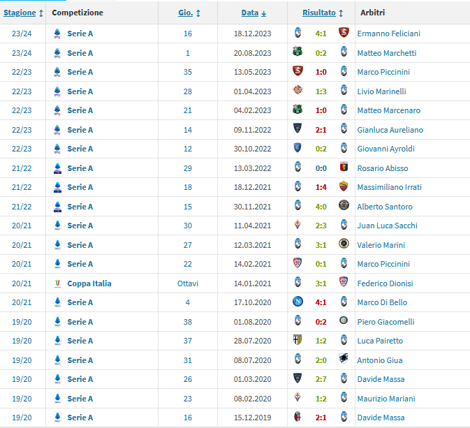 Questi i precedenti per Sacchi, che non arbitra l'Atalanta da quasi un anno e mezzo
