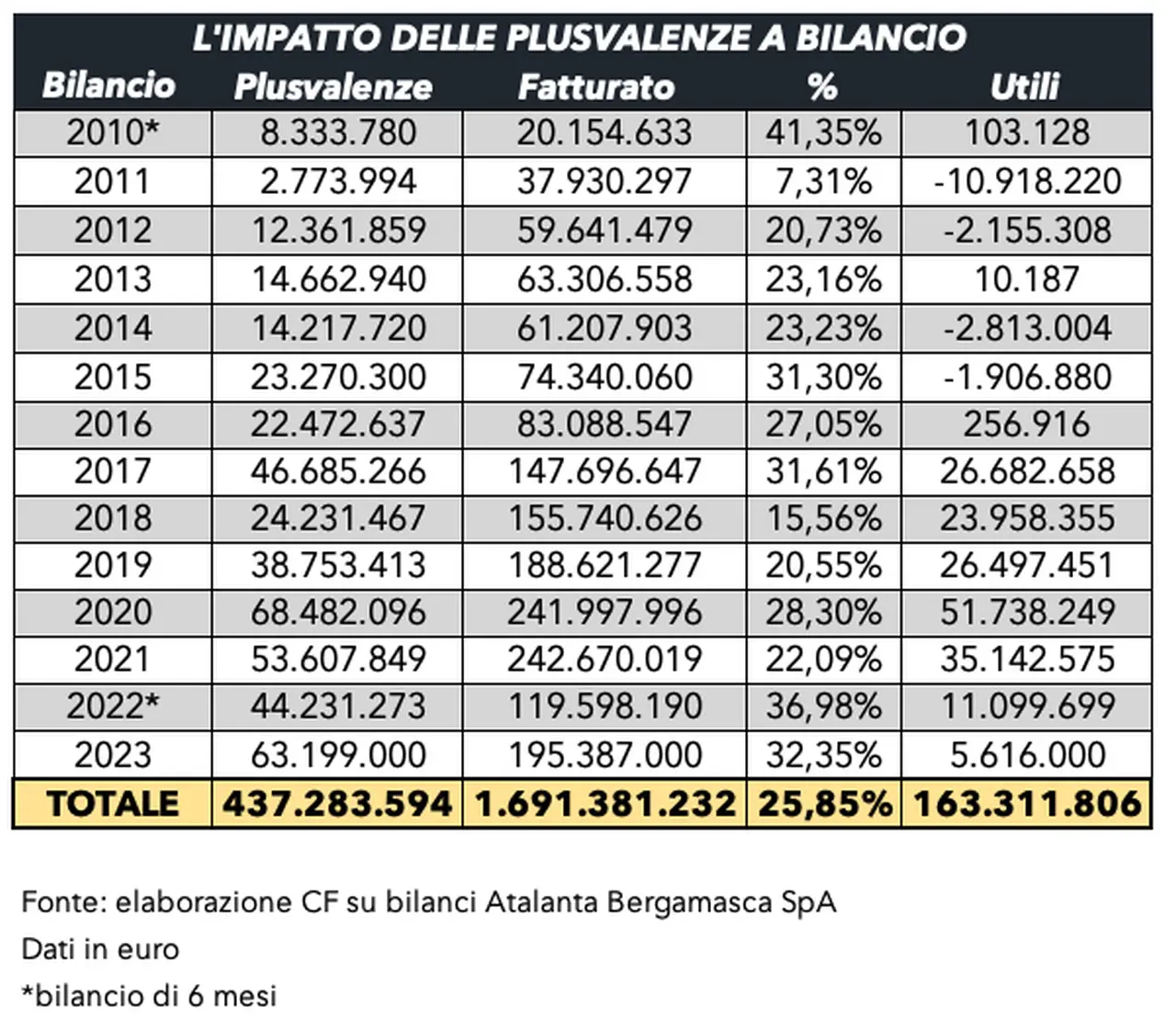 Il dato di questa stagione porta il totale delle plusvalenze dell’era Percassi a oltre 437 milioni di euro. Sommando tutti i dati dal 2010 a oggi, si tratta di quasi il 26% rispetto al fatturato complessivo fatto registrare dai bergamaschi, pari a 1,69 miliardi di euro (il record risale al 2021, con un fatturato superiore ai 242 milioni di euro).