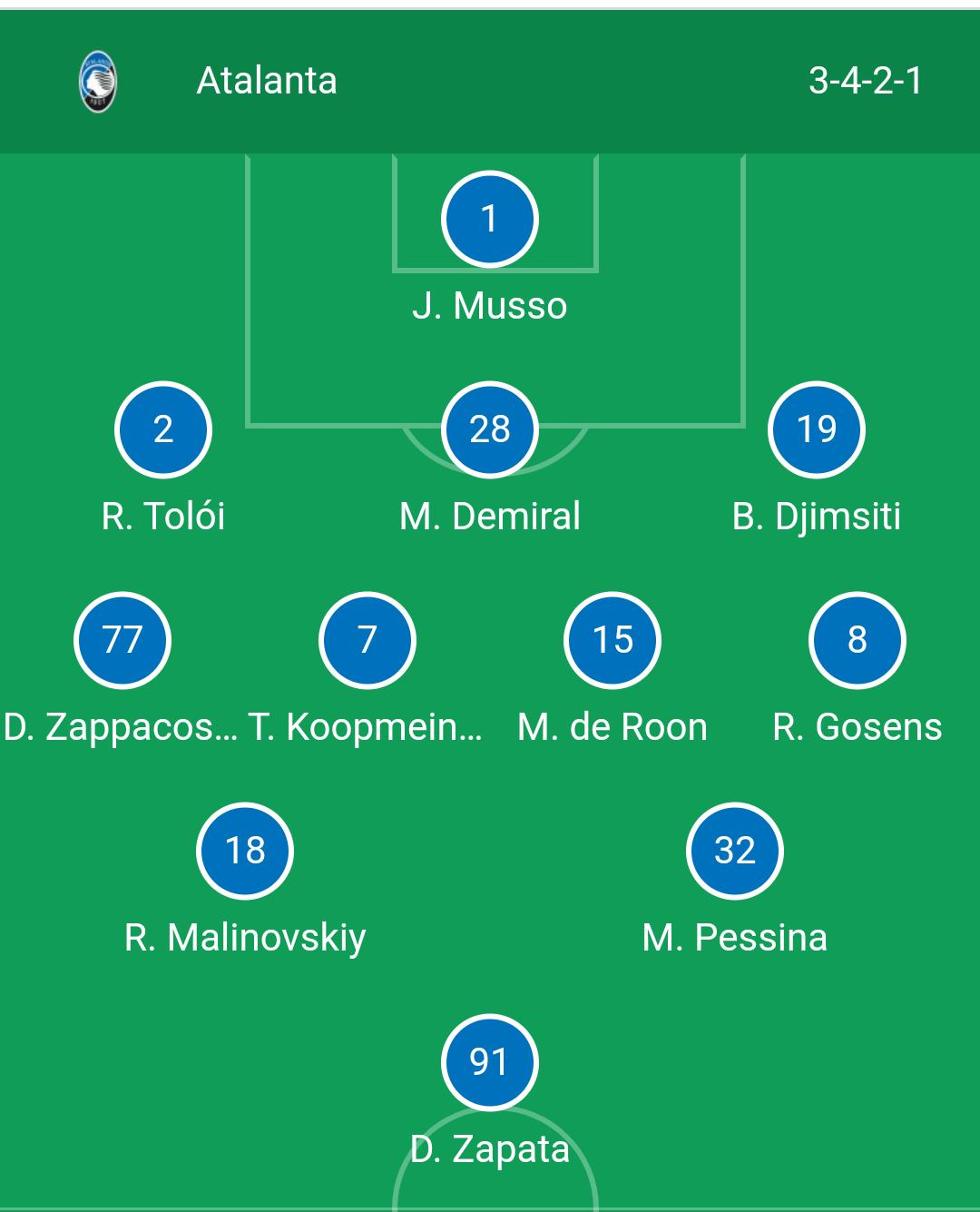 ATALANTA (3-4-1-2): Musso; Toloi, Demiral, Djimsiti; Zappacosta, De Roon, Koopmeiners, Gosens; Pessina; Malinovskyi, Zapata. All. Gasperini