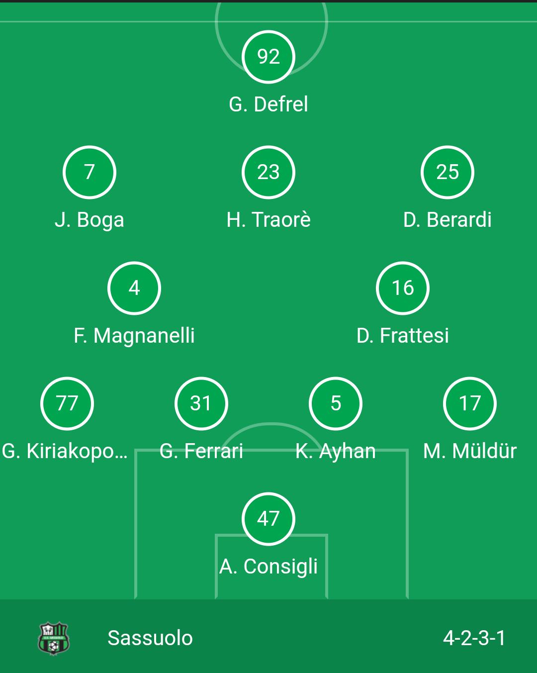 SASSUOLO (4-2-3-1): Consigli; Muldur, Ayhan, Ferrari, Kyriakopoulos; Magnanelli, Frattesi; Berardi, Traoré, Boga; Defrel. All. Dionisi