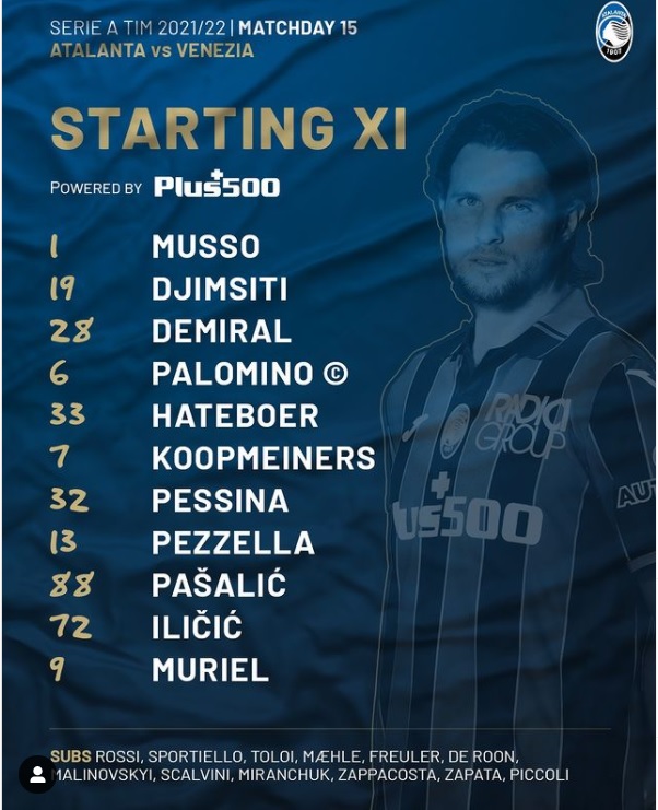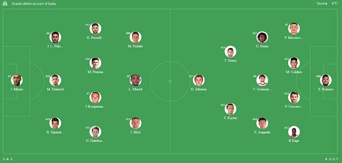 ATALANTA – Musso; Djimsiti, Demiral, Palomino; Hateboer, Koopmeiners, Pessina, Pezzella; Pasalic; Ilicic, Muriel.