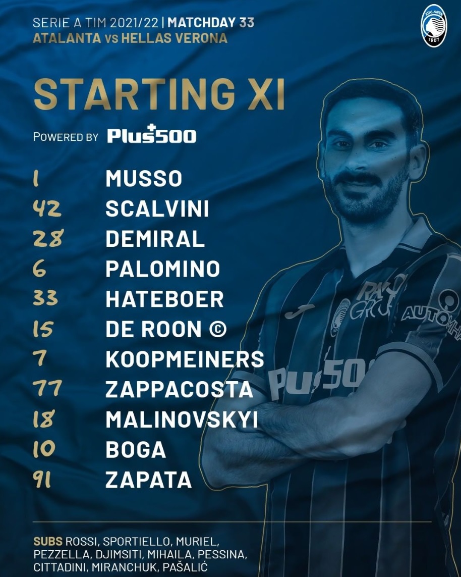 A disposizione: Rossi, Sportiello, Cittadini, Muriel, Freuler, Pezzella, Djimsiti, Mihaila, Pessina, Miranchuk, Pasalic. Allenatore: Gian Piero Gasperini
