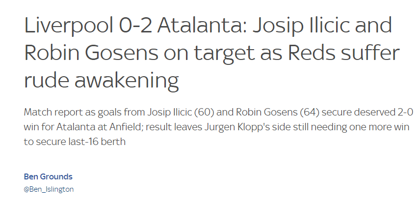 Meglio tardi che mai. Il nostro corrispondente dall'Inghilterra Nigel ci ha fornito (ma il ritardo è colpa nostra) alcuni titoli relativi a giornali inglesi su Liverpool - Atalanta. Consoliamoci dopo le ultime 2 partite non proprio brillanti dei nostri...