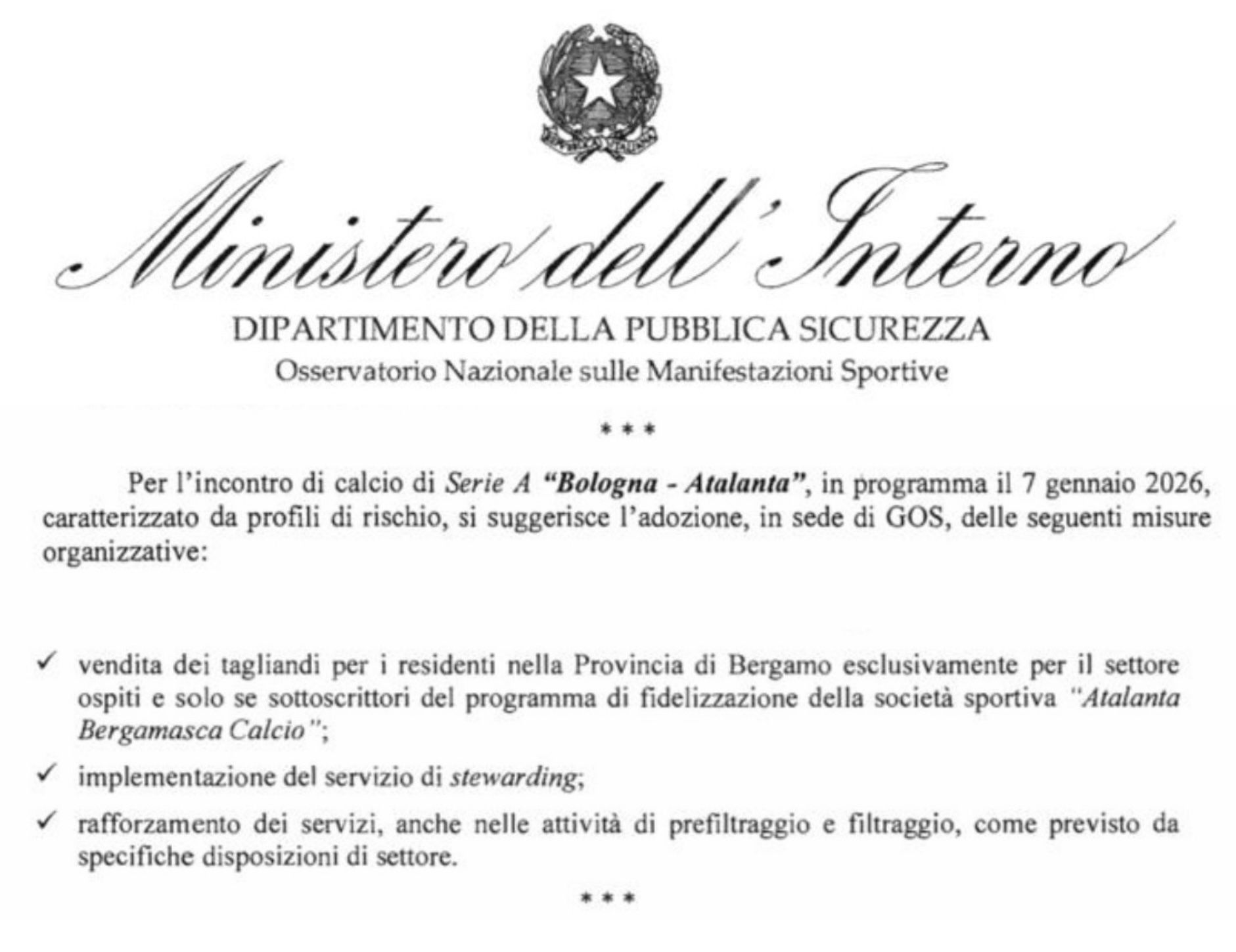 Secondo quanto comunicato dal Bologna FC, i biglietti del Settore ospiti per assistere a Bologna-Atalanta, in programma alle 18:30 di mercoledì 7 gennaio 2026 allo Stadio Renato Dall'Ara di Bologna, sono a disposizione degli sportivi interessati fino alle 19 di martedì 6 gennaio.