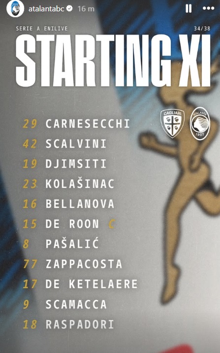ATALANTA (3-4-2-1): Carnesecchi: Scalvini, Djimsiti, Kolasinac; Bellanova, De Roon, Pasalic, Zappacosta; De Ketelaere, Raspadori; Scamacca.