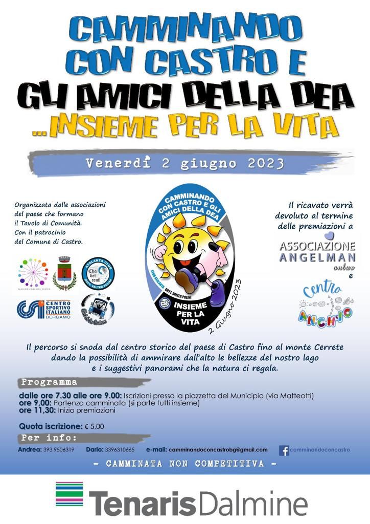"Buongiorno a tutti la presente per invitare tutti alla camminata atalantina che come l'anno scorso avrà luogo il 2 Giugno a Castro. Quest'anno la camminata nerazzurra ufficiale che fanno a Bergamo è saltata quindi di fatto la nostra sarà l'unica camminata (con un panorama mozzafiato) a tinte nerazzurre. Vi aspettiamo numerosi.In allegato trovete la locandina dell'evento e la brochure."