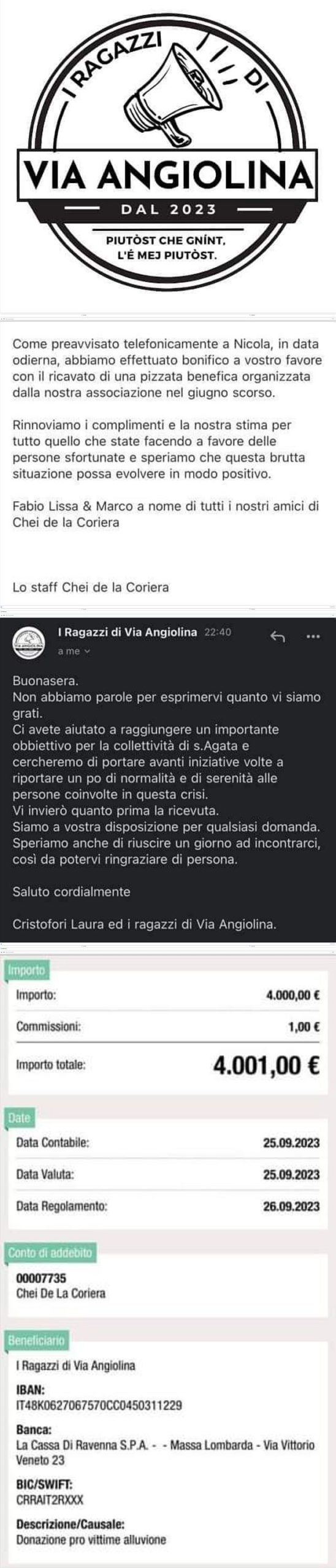 Nelle settimane scorso pregevolissima opera di raccolta del gruppo trasfertista "Chei de la Coriera" che sono riusciti a raccogliere 4000 euro per le popolazioni alluvionate della Romagna. In particolare i beneficiari sono stati ""I Ragazzi Di Via Angiolina", che operano in quel di Massa Lombarda
