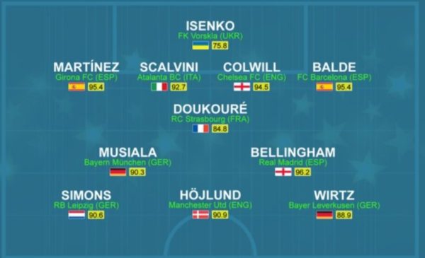Top 11 (4-3-3): Isenko (Vorskla); Martinez (Girona), Scalvini (Atalanta), Colwill (Chelsea), Balde (Barcellona); Musiala (Bayern Monaco), Koukouré (Strasburgo), Bellingham (Real Madrid); Xavi Simons (Lipsia), Hojlund (Manchester United), Wirtz (Bayer Leverkusen).