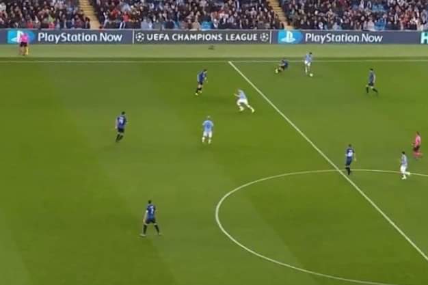 La palla è sull’esterno tra i piedi di un giocatore del Manchester che può giocare in profondità. De Bruyne attacca lo spazio alle spalle di De Roon con una scelta di tempo perfetta.