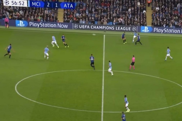 È indubbio che De Roon deve “stare più dentro” e vedere l’inserimento del belga. Marten è un centrocampista ed è comprensibile che possa commettere qualche errore di tecnica individuale. Il mio pensiero personale è quello che Djimsiti, vedendo il compagno fuori posizione dovrebbe scappare per difendere lo spazio alle sue spalle. Invece appena parte il passaggio il centrale neroazzurro sta salendo sul suo riferimento (Aguero) e viene preso in contro-tempo. Questo è un errore importante per me ma non è detto che lo sia per il mister, dipende sempre da cosa chiede ai suoi in queste situazioni; con una palla simile, sempre nella stessa partita ho notato che Jimmy è “scappato”.