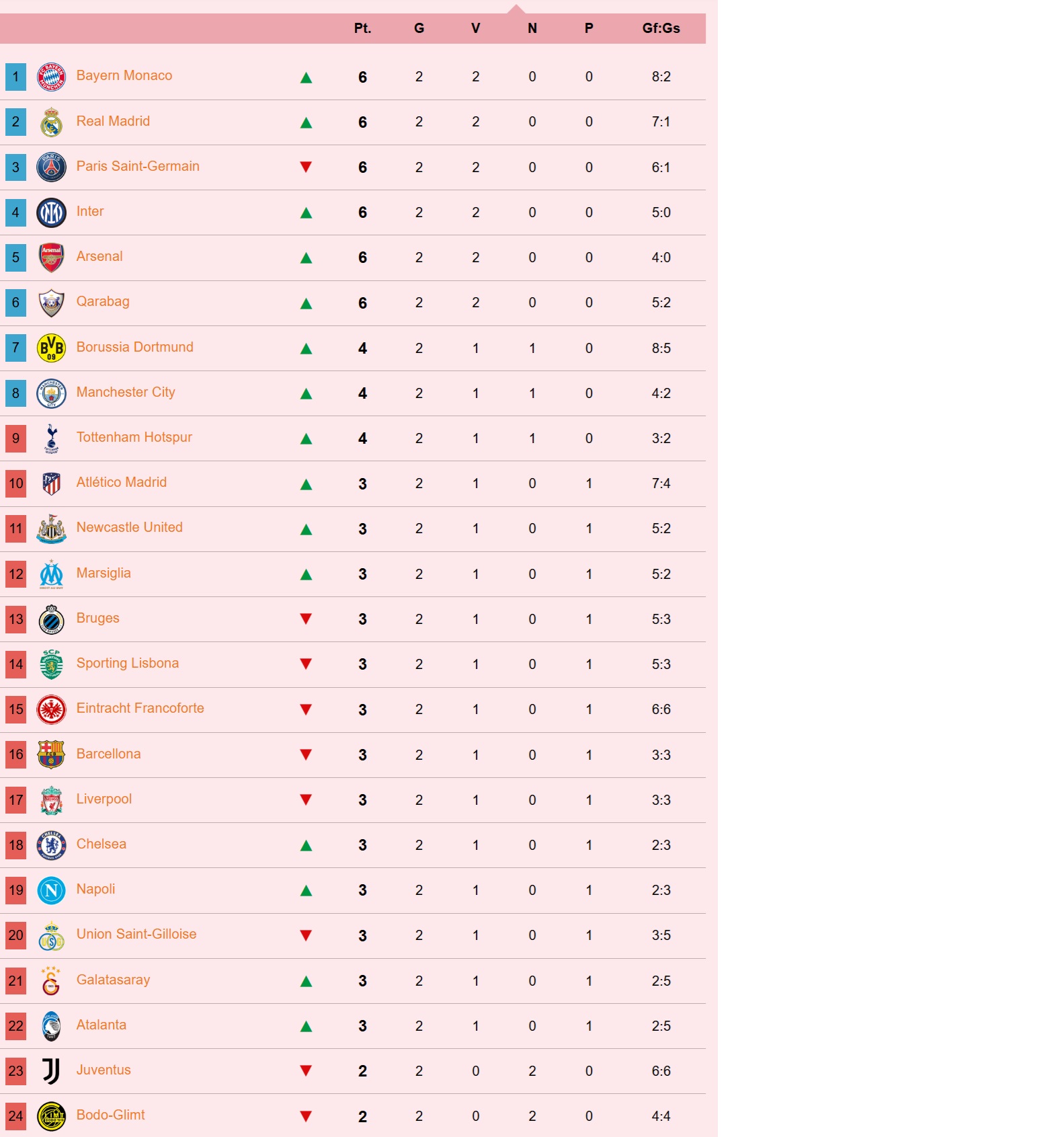 Risultati e Classifica CL dopo il 2 turno: Atalanta 22ma