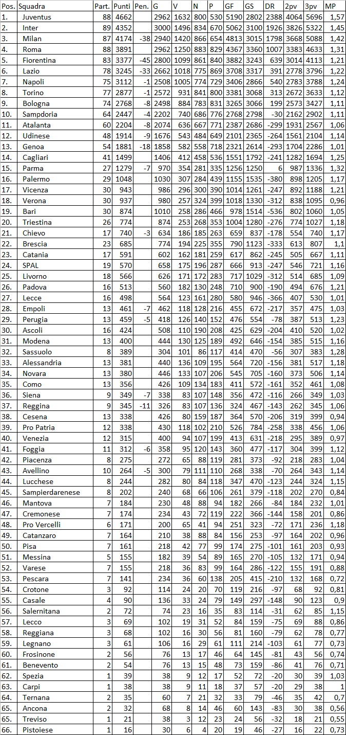 Classifica perpetua serie A dal 1929 -- Atalanta 11ma