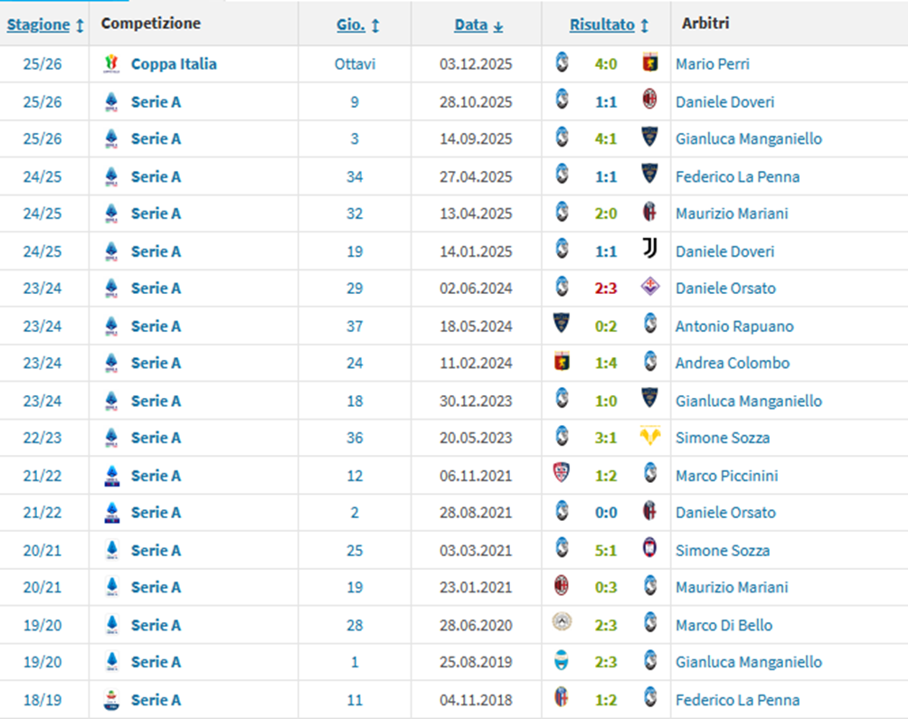 Quattordicesima direzione per Pairetto con l'Atalanta e diciannovesimo gettone per Chiffi al VAR