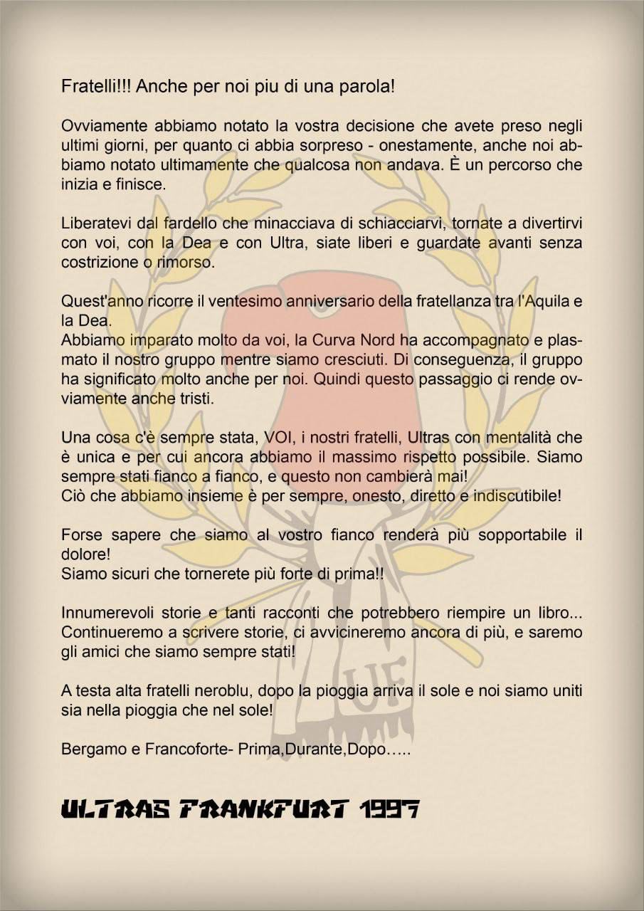 A seguito dello scioglimento dei Supporters, ecco quello che hanno pubblicato i tifosi dell'Eintracht Francoforte da molti anni tra i piu' stretti gemellati