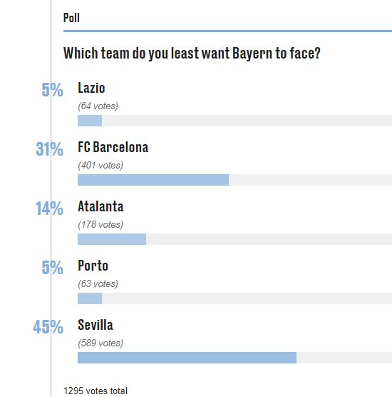 Quello sotto e' l'esito di un sondaggio chiesto ai tifosi del Bayern Monaco, su un loro sito, prima del sorteggio di oggi.