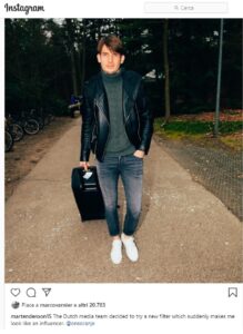 Prosegue la sequenza di post ironici di Martino su Instagram, in questo caso si prende in giro dicendo che sembra un influencer. In dettaglio "Il team dei media olandesi ha deciso di provare un nuovo filtro che improvvisamente mi fa sembrare un influencer"