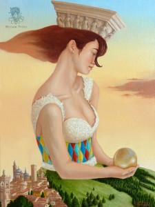 Il quadro "Allegoria di Bergamo", (olio su tela, 76x56 cm, 2018) come ci spiega Diego De Lorenzi, rappresenta una figura femminile che richiama il mito di Atalanta, fanciulla bellissima e campionessa nella corsa, rappresentata con i capelli come nuvole, in testa il capitello del Palazzo della Ragione (che simboleggia l’unione dei cittadini), il corpetto colorato come riferimento ad Arlecchino, famosa maschera della commedia dell’Arte, nata a Bergamo, e tra le mani la mela d’oro, importante simbolo nella mitologia di Atalanta. La gonna è una veduta di Bergamo alta.