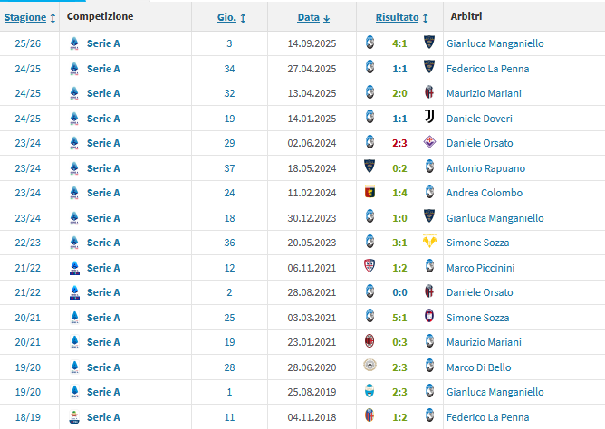Questi i precedenti di Doveri da arbitro con l'Atalanta