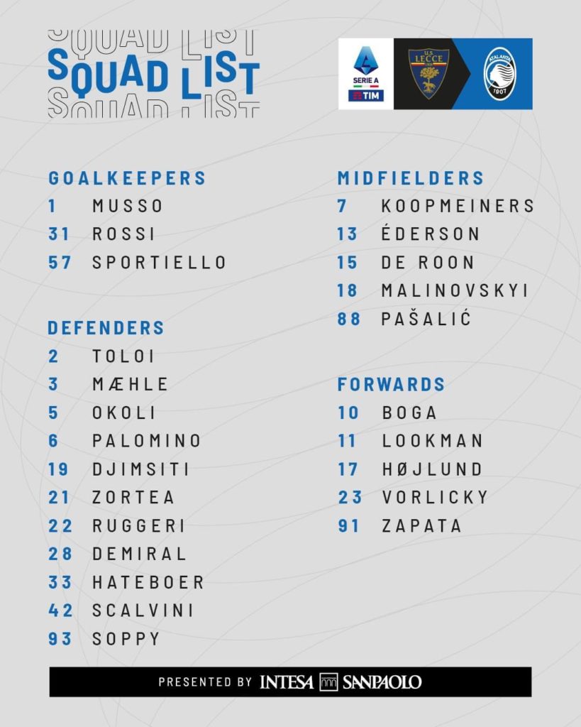 Non in lista solo Muriel e Zappacosta, Vorlicky aggregato alla prima squadra.