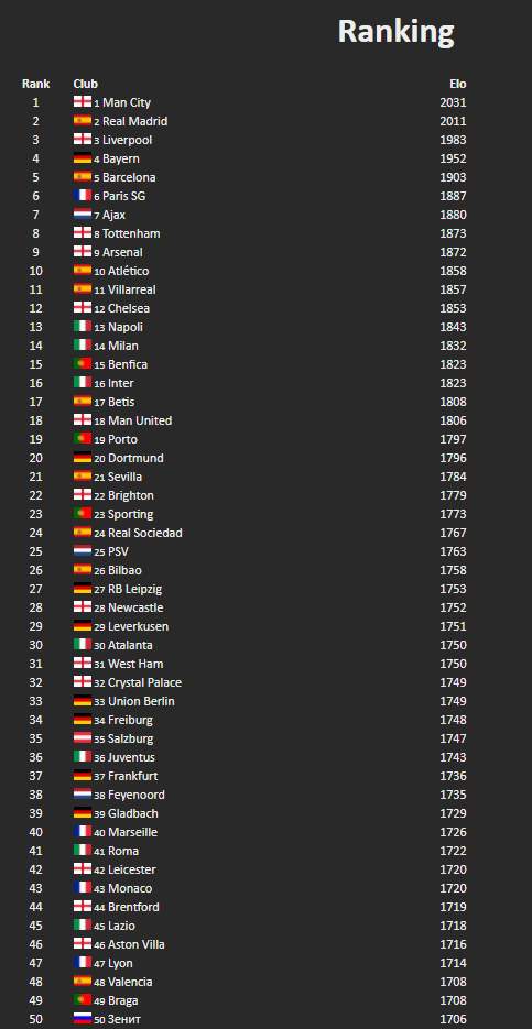 Come scritto altre volte l'ELO Ranking e' nato negli scacchi per comporre classifica dei campioni in ambito mondiale. E' da anni applicato a calcio e altri sport e, perlomeno nel fubal, dà risultati piu' realistici del ranking UEFA anche se e' solo quest'ultimo quello ufficialmente riconosciuto.