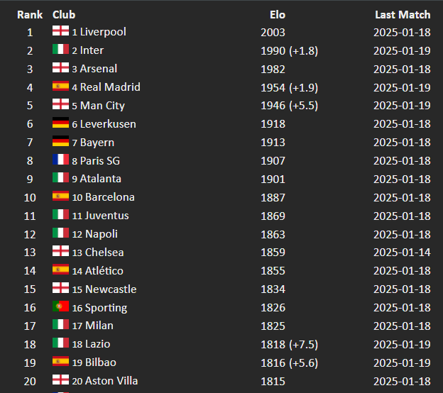 Dal nostro precedente sesto posto (che, ricordiamo, e' il nostro massimo di sempre) e causa gli ultimi incontri di campionato, scivoliamo al nono posto, superati da Leverkusen, Bayern e PSG (mica pizza e fichi....) ma, insomma, siamo sempre li', attaccati al treno. E persino davanti al Barcellona....