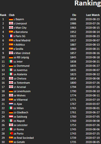 Il ranking europeo per club in base all'ELO Rating, di derivazione scacchistica e quasi unanimemente ritenuto piu' aderente alla realta' rispetto al raking UEFA ufficiale. Chiudiamo 14mi e terzi in Italia, vicinissimi a Inter e Juventus. Qui sotto le prime 30 posizioni.
