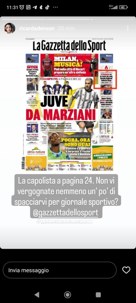 Stamattina Otis ha contestato sui social il poco spazio dedicato all'Atalanta sulla Gazzetta dello Sport. Niente titoloni, un trafiletto di spalla e poi tutto a pagina 24.
