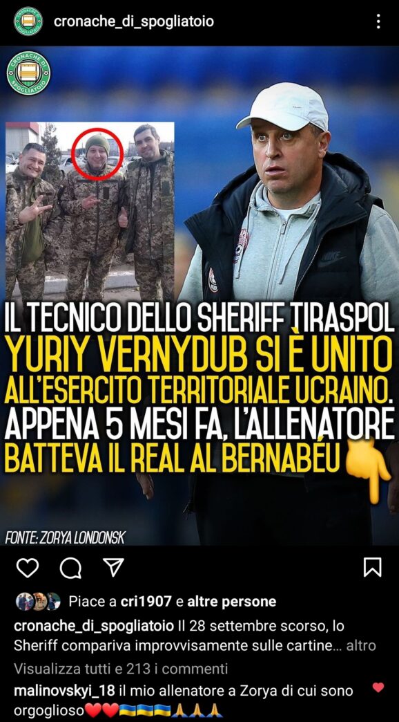 Jurij Vernydub , allenatore di Malinovskyi quando militava nelle fila dello Zorya, ha lasciato le redini dello Sheriff, squadra moldava che solo pochi mesi fa batteva il Real in Champions, per difendere l'Ucraina.