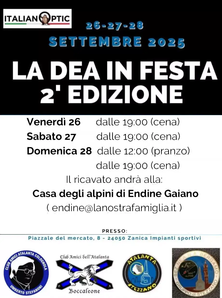Dal 26 al 28 settembre Zanica ospita la seconda edizione di “Dea in Festa”, l’evento che unisce il tifo per l’Atalanta alla beneficenza. Tutto il ricavato andrà a favore della Casa degli Alpini di Endine Gaiano, luogo importante per iniziative sociali e di volontariato.