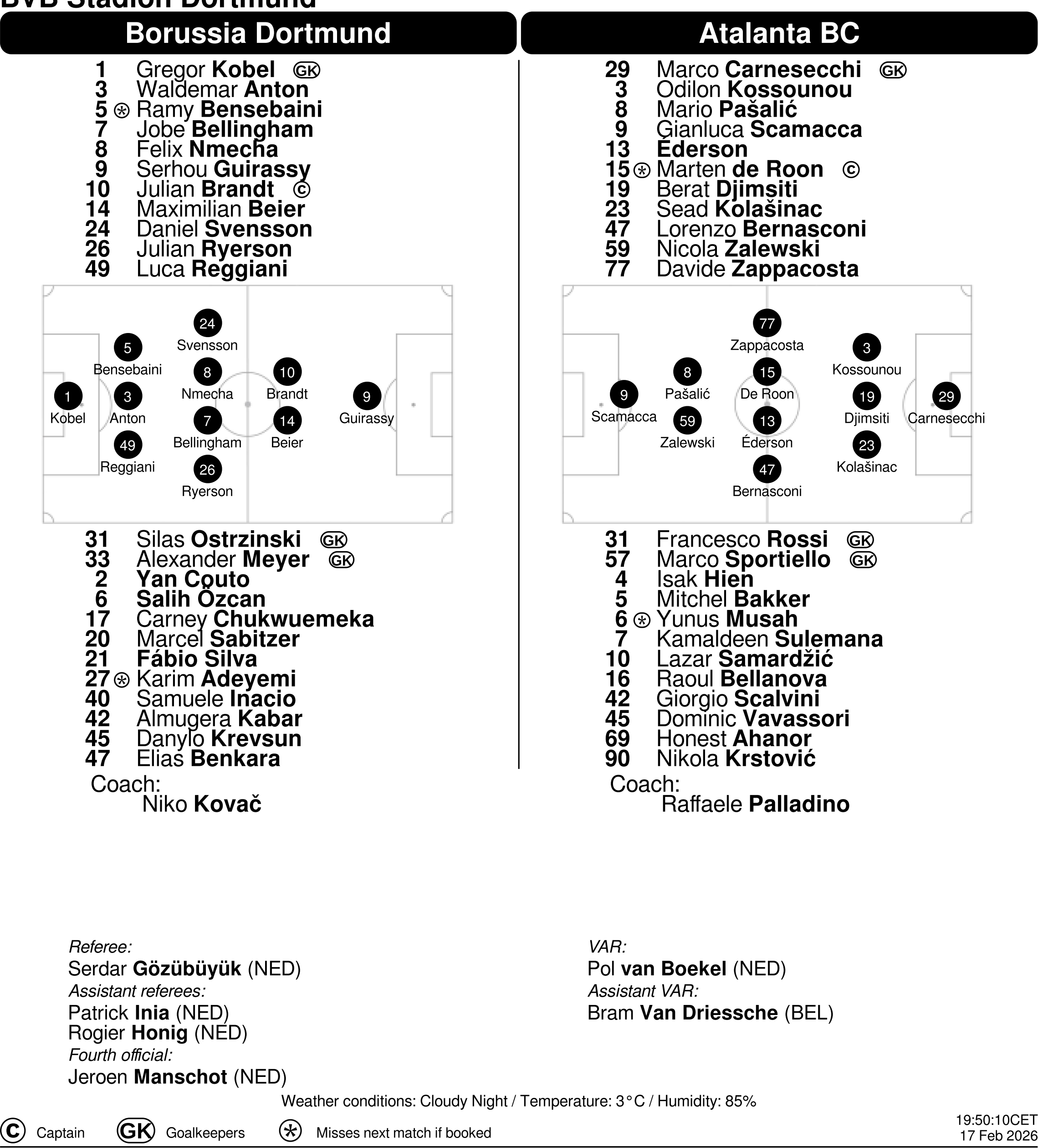 FORMAZIONI UFFICIALI DI BORUSSIA D. - ATALANTA, SCAMACCA E PASALIC TITOLARI