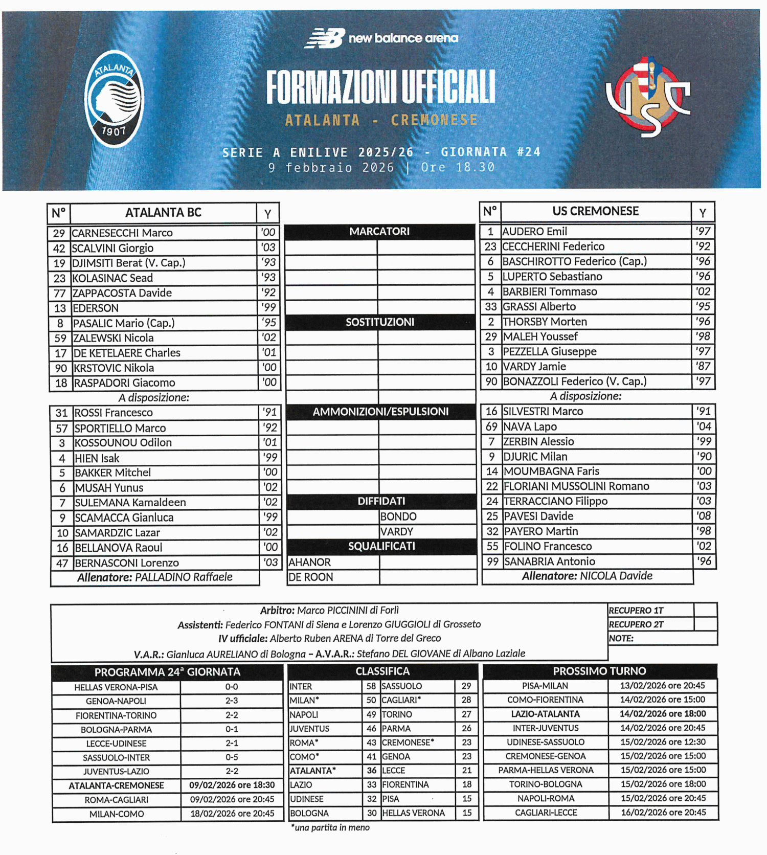 FORMAZIONI UFFICIALI DI DEA - CREMO: attacco con CKD, Krstovic e Raspa