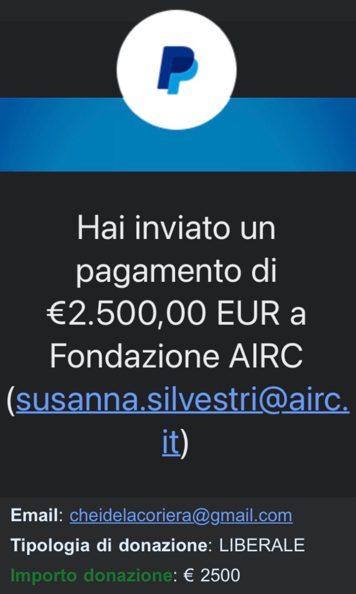 Chei dela Coriera, vicini al giornalista, hanno devoluto in questi giorni, e in un momento non certo propizio, 2500 euro all'AIRC, Associazione Italiana per la Ricerca sul Cancro. Qui sotto la ricevuta della donazione.
