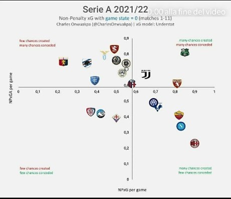 Nonostante i risultati siano pressoché uguali, un grafico normalizzato riguardante gli NPxG/NPxGA a partita (gol che avremmo dovuto segnare/subire in relazione a quanto creato/concesso, esclusi i rigori), fa drizzare le orecchie poiché pone l’Atalanta nel terzo quadrante, quello in cui si collocano le squadre che creano e concedono poco, insieme a Cagliari e Fiorentina.
