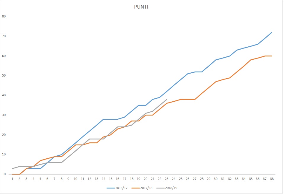 La prima cosa che salta all'occhio è che alla 23 giornata appena trascorsa abbiamo 4 punti in meno (circa il 10%) rispetto alla cavalcata del 4 posto e due in più rispetto allo scorso anno (42-38-36). Considerando i prossimi impegni ed il trend di due anni fa (3 vittorie dalla 24 alla 26) è possibile che il distacco aumenti rispetto al 4° posto del primo anno.