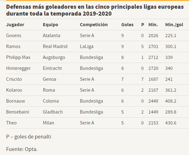 Gosens e' primo per gol tra i difensori dei 5 maggiori campionati d'Europa. Primo anche rispetto ai minuti giocati. Fonte Opta Stats