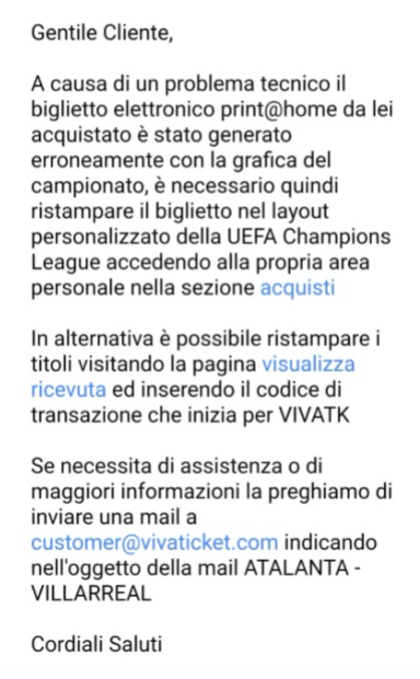 Tutti gli interessati che hanno comprato il biglietto sul circuito VivaTicket, dovrebbero aver ricevuto la mail (il testo nell'immagine che apre questo articolo) che spiega il disguido.