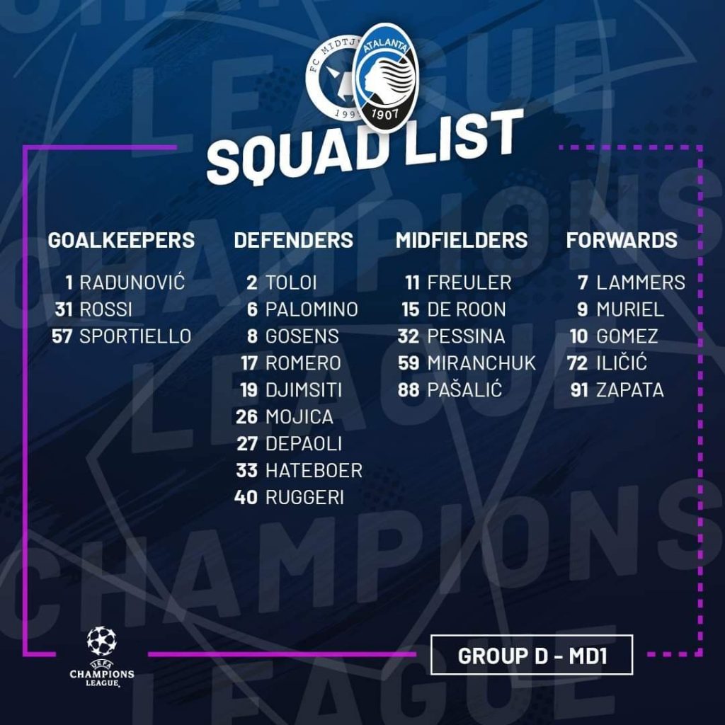 Sono 22 i convocati da mister Gian Piero Gasperini per Midtjylland-Atalanta, gara della prima giornata del Gruppo D di UEFA Champions League 2020-2021 in programma domani alle ore 21 alla MCH Arena di Herning.