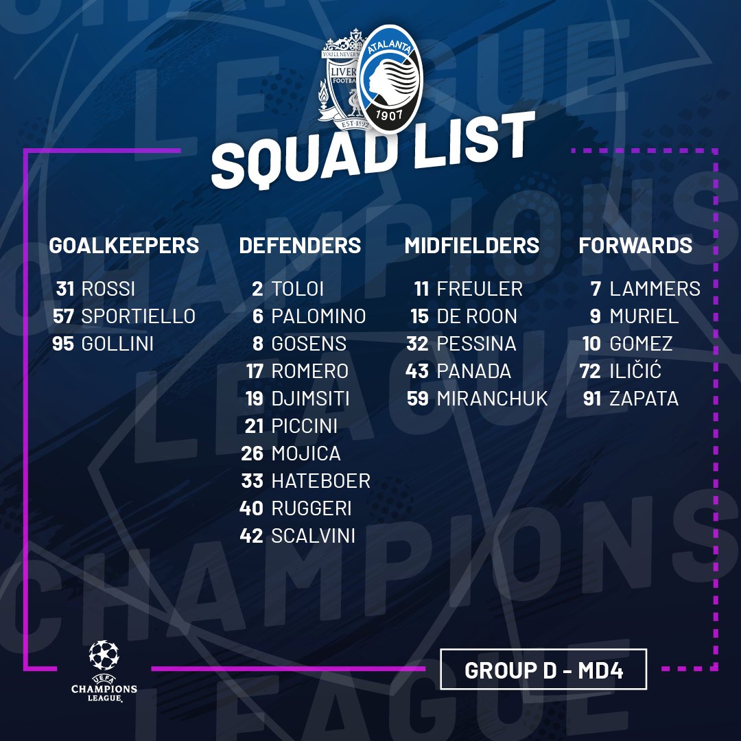 Sono 23 i convocati da mister Gian Piero Gasperini per Liverpool-Atalanta, gara della quarta giornata del Gruppo D di UEFA Champions League 2020-2021 in programma domani alle ore 21 allo stadio Anfield di Liverpool.
