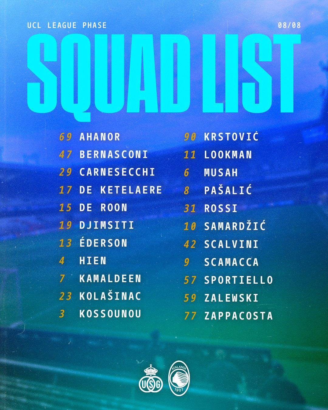 Sono 22 i calciatori convocati da mister Raffaele Palladino per Union Saint-Gilloise-Atalanta, gara della 8ª giornata della League Phase della UEFA Champions League 2025/26 in programma alle ore 21 al Lotto Park di Anderlecht: