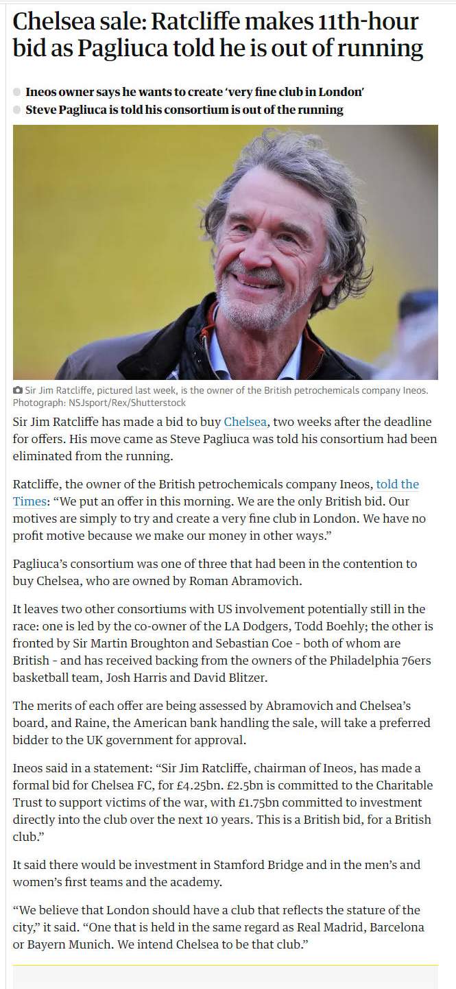 Restano altri due consorzi con il coinvolgimento degli Stati Uniti potenzialmente ancora in gara: uno è guidato dal comproprietario dei LA Dodgers, Todd Boehly; l'altro è guidato da Sir Martin Broughton e Sebastian Coe - entrambi britannici - e ha ricevuto il sostegno dei proprietari della squadra di basket dei Philadelphia 76ers, Josh Harris e David Blitzer.
